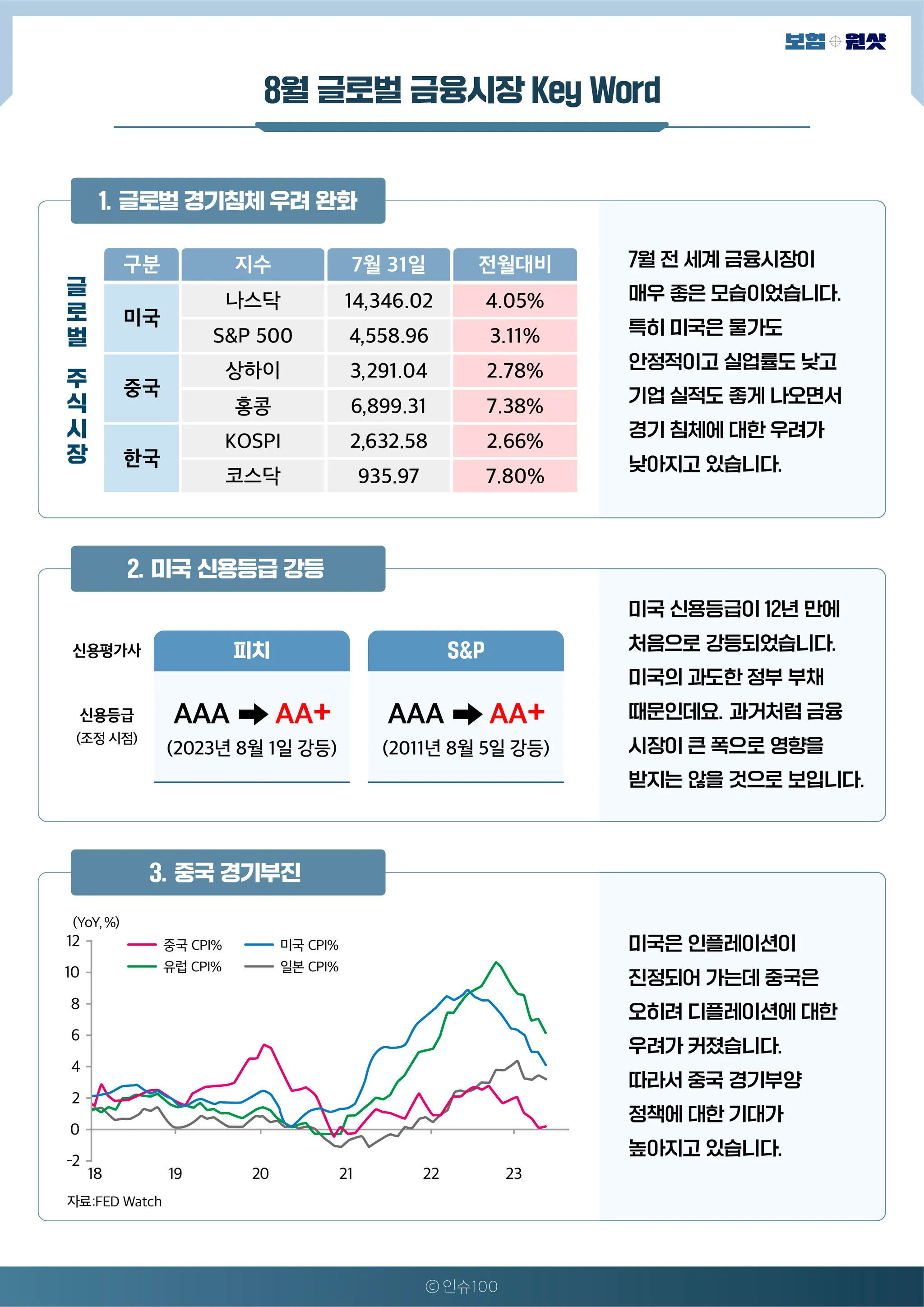7월 전 세계 금융시장이 매우 좋은 모습이었습니다. 특히 미국은 물가도 안정적이고 실업률도 낮고 기업 실적도 좋게 나오면서 경기 침체에 대한 우려가 낮아지고 있습니다.