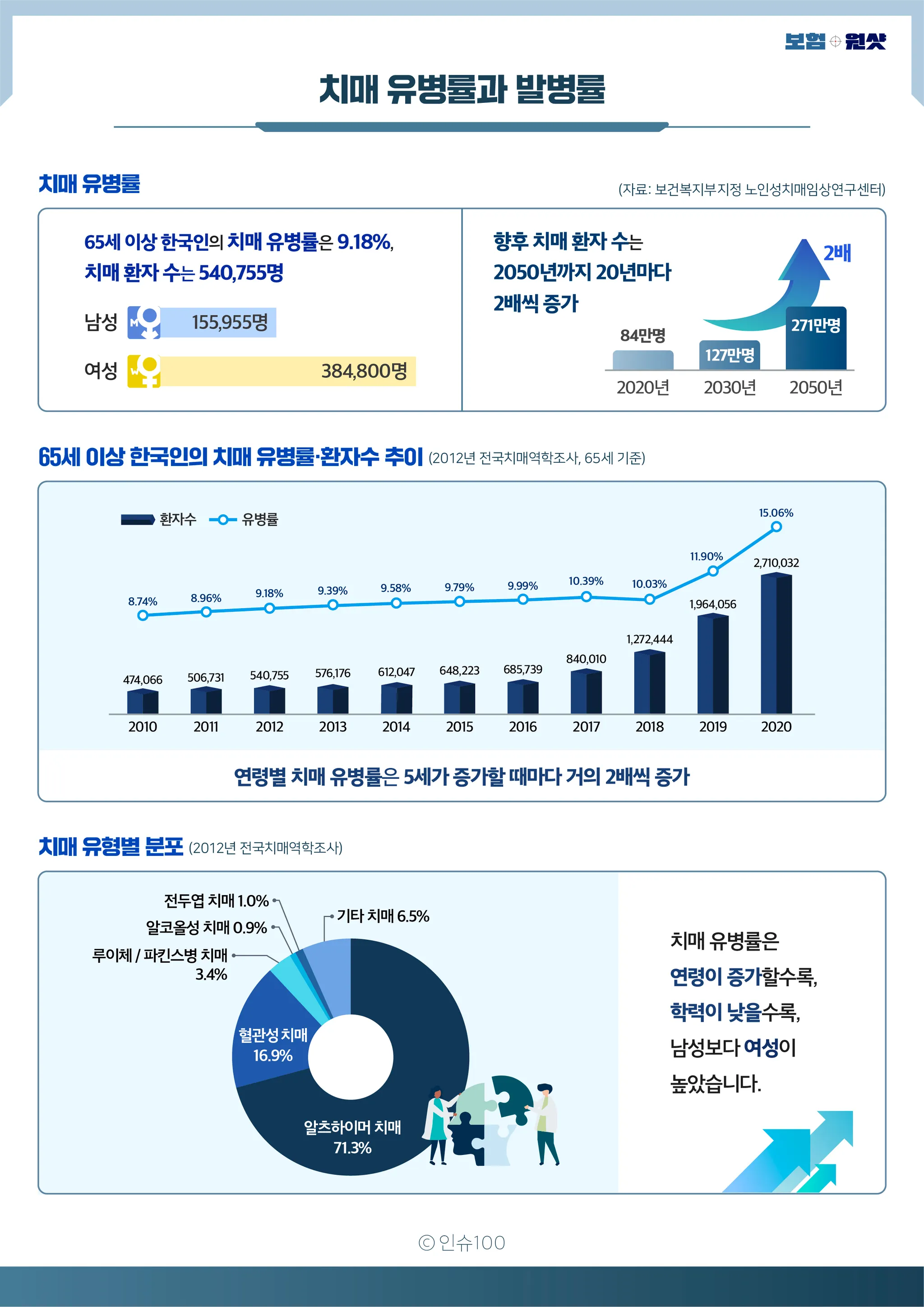 우리나라의 2012년 전국치매역학조사 결과, 2012년의 65세 이상의 노인의 치매 유병률은 9.18% 이었고, 치매 환자수는 540,755명 (남성 155,955명, 여성 384,800명)으로 추정되었습니다.