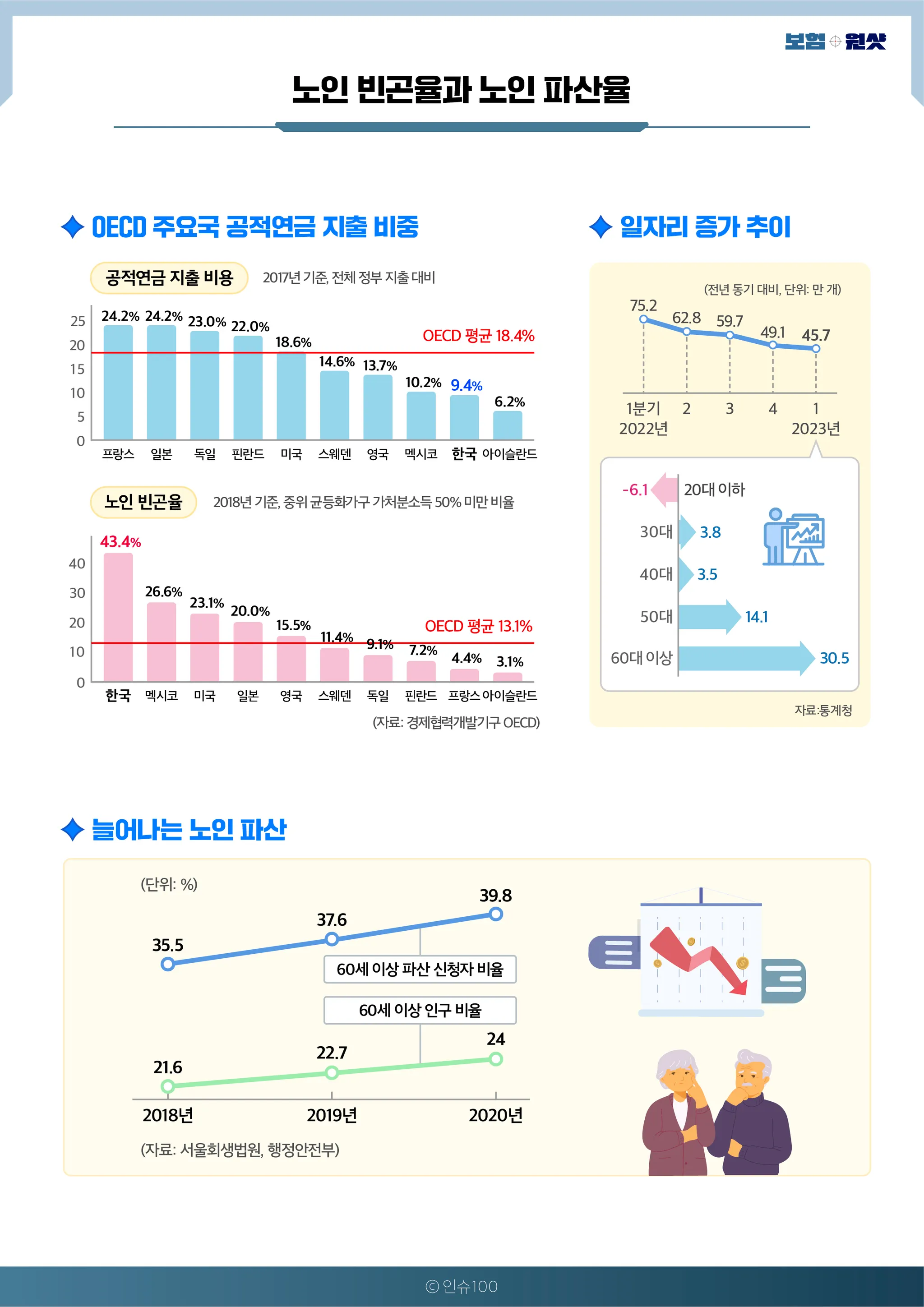 삶이 팍팍하고 은퇴 후 일을 해야 생활이 되니, 빚을 내서 자영업을 하다가 망하거나 몸이 아파 빚을 내서 병원비로 지출 후 파산을 하는 분들이 많습니다.
